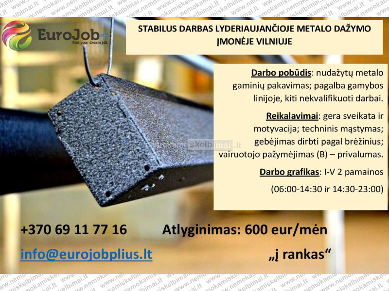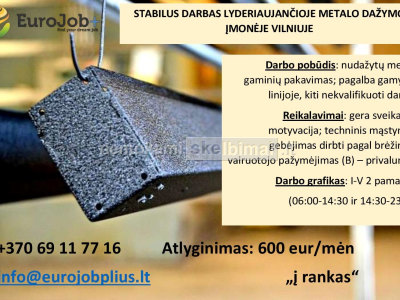 Darbo pobūdis: nudažytų metalo gaminių pakavimas; pagalba gamybos linijoje; kiti nekvalifikuoti darbai.