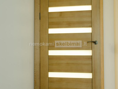 Durų komplekto kaina apie 270 Eur. Komplektą sudaro durų varčia su užlaida, stakta, įstatoma guminė tarpinė staktoje, reguliuojami vyriai, spynelė, apvadų komplektas iš abiejų pusių, stiklas, beicavimas-lakavimas pasirinkta spalva.