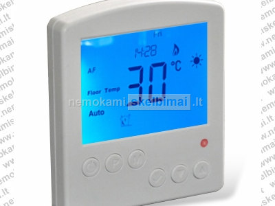 Komutacijos srovė iki 16A, 220V (3500W). Dydis: 85mm x 85mm x 30mm. LCD monitorius su apšvietimu. Sensoriai: Oras ir Grindys. Programavimas: 7 dienos, 4 režimai kiekvieną dieną. Rankinis temperatūros režimo nustatymas. Komplekte su grindų temperatūras sensoriumi.