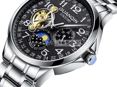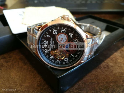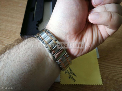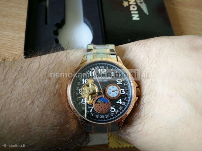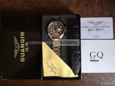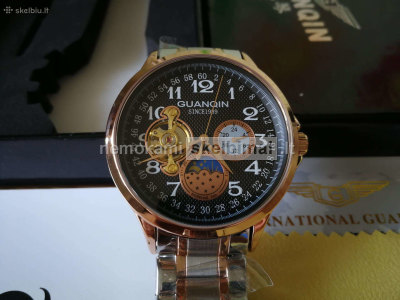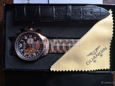 Parduodamas gražus, išskirtinis aukso+sidabro+juodos spalvų derinio firminėje dėžutėje mechaninis 21 akmens GUANQIN laikrodis. Ciferblato diametras 43mm storis 1.35cm, apyrankės ilgis 22cm plotis 20mm. Laikrodžio korpusas plieninis 316l plieno, apyrankė taip pat 316L plieno plius kaip dovana juodas nat odos dirželis, stikliukas atsparus pabraižymams, taip pat kaip dovana. Visos rodyklės veikia, rodo laiką, paros metą. Laikrodžio komplekte pats laikrodis, stiklų valymo servetėlė, tarptautinė garantinė korta, instrukcinė knygelė bei firminė dėžutė, dar ir dovana. Kaina tik 48€, bet dar negalutinė! Siuntimas į kitą miestą +2€