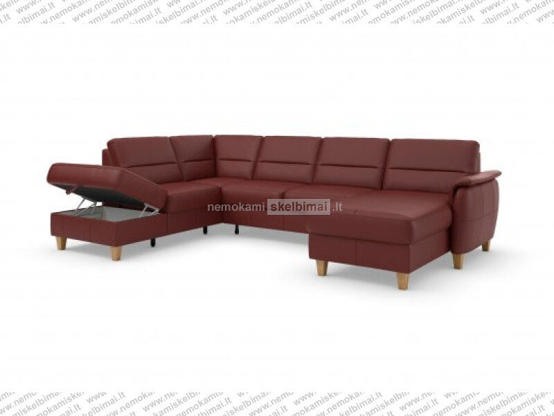 Modernus geros kokybės kampas,pilnai dengtas labai geros kokybės naturalia oda (nugara nuo sienos dengta audiniu). Spyruoklinis blokas, turi miegamą funkcija ir patalynės dėžę .