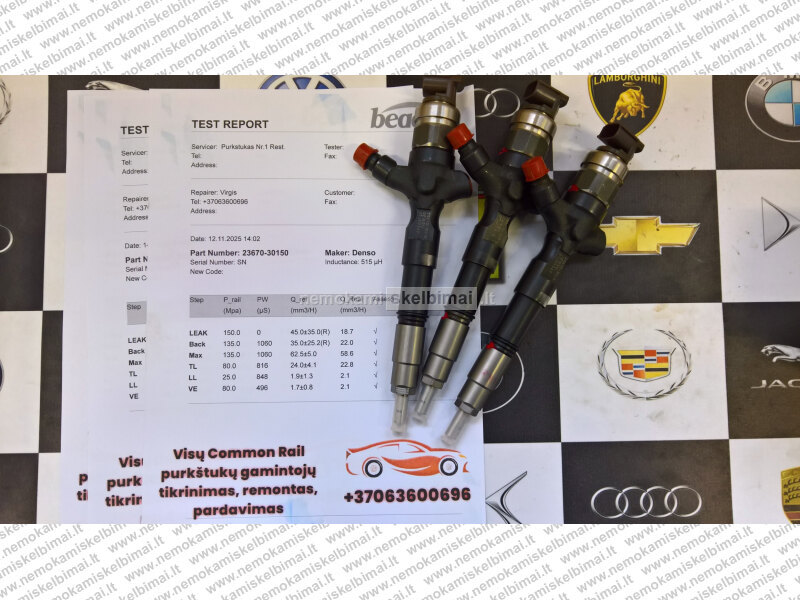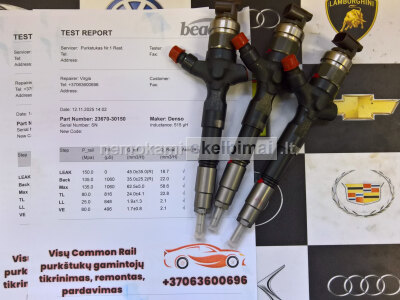 Kuro purkštukai tinkantys Toyota – Hiace, - Hilux 2.5d 70-75-86-88 kw. Kodas: 23670-30150. Yra 3 vienetai. Restauruoti, kaina po 100 €. Kiti kodai: 23670-30250, 23670-30310, 23670-39145, 23670-39146, 23670-39245, 23670-39285, 095000-6770, 095000-7040, 095000-7041, 095000-7420, 095000-7430, 095000-7790, 095000-7800, 095000-7801, DCRI107800.