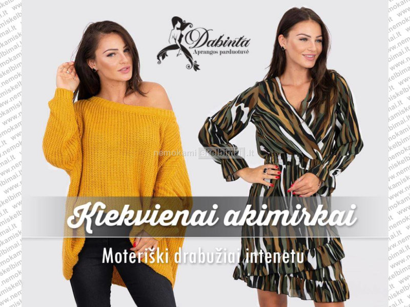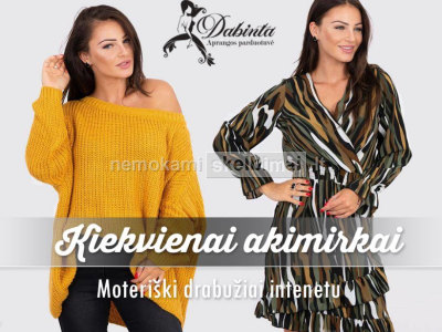 Moteriški drabužiai internetu: suknelės, palaidinės, tunikos, sportinė apranga moterims, moteriški megztiniai, kardiganai, kombinezonai moterims, striukės moterims, šalikai ir kepurės.