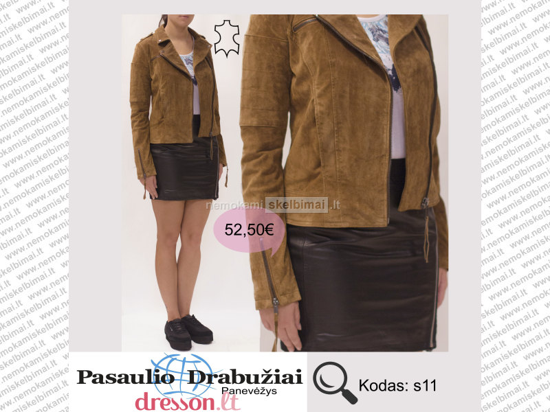 Rudos spalvos, natūralios odos striukė su pamušalu ir kišenėmis šonuose. Ant krūtinės - kišenės imitacija.
