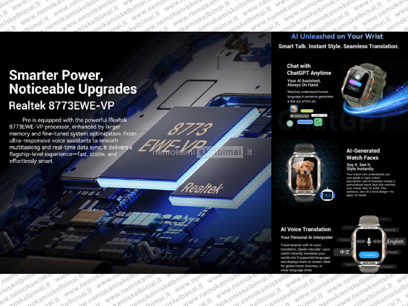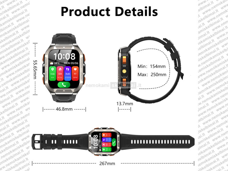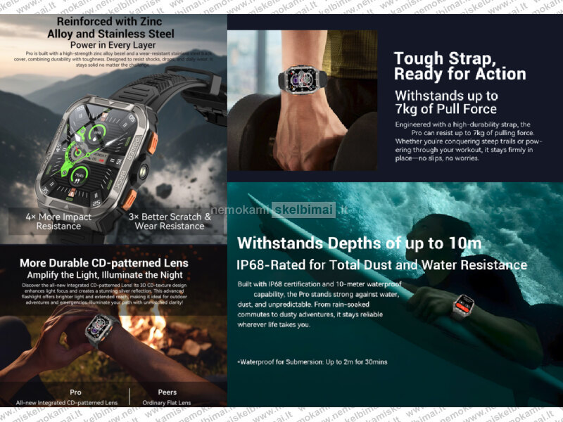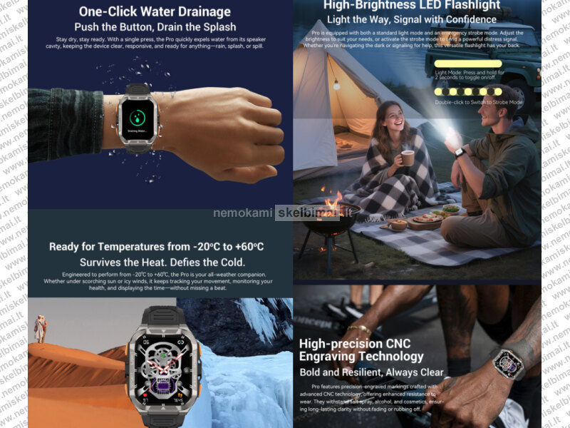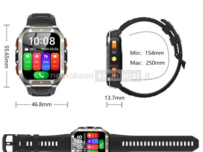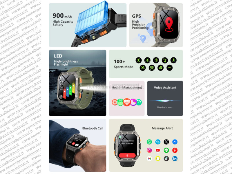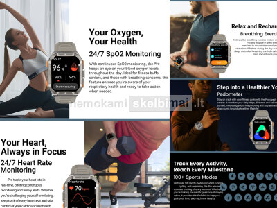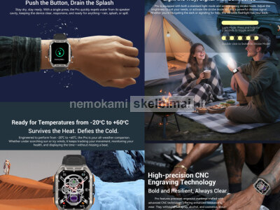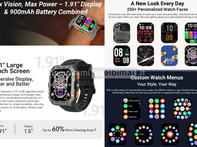 Laikrodis palaiko skambučius per „Bluetooth“, rodo pranešimus iš telefono ir turi keičiamus ekrano viršelius. Idealus pasirinkimas žygiams, sportui ar kasdieniam naudojimui tiems, kam atsibodo krauti laikrodį kas antrą dieną.