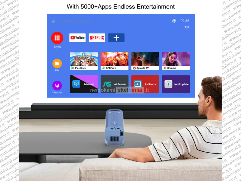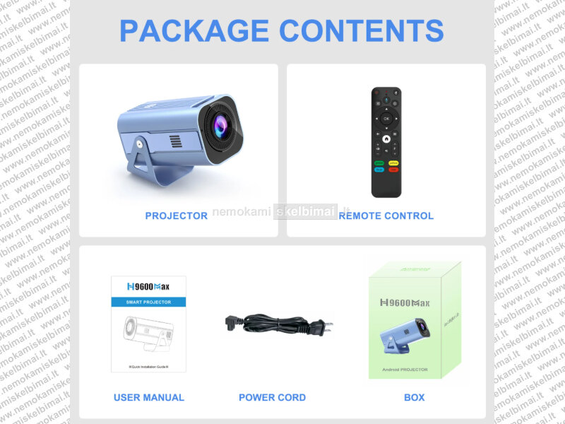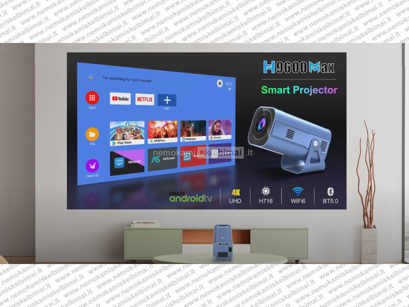 - PILNAI SUKONFIGŪRUOTAS IR PARUOŠTAS NAUDOJIMUI! NEREIKIA PAPILDOMŲ ĮRENGINIŲ – VISKAS YRA ĮMONTUOTA Į ŠĮ KOMPAKTIŠKĄ PROJEKTORIŲ! H9600 MAX 4K ULTRA HD SMART ANDROID PROJEKTORIUS TURI PAKANKAMAI ATMINTIES 2GB RAM / 16GB ROM! - TODĖL NESTRINGA, VEIKIA ITIN SKLANDŽIAI IR GREITAI, NEKAISTA, YPAČ TYLUS!