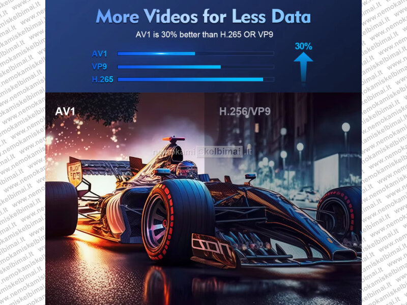 - Vaizdo failų formatai - AV1, MP4, UHD, FLV, MPEG-4, 3GP, DIVIX, XVID, H.265, DH.263, H.264, MPEG-2, WMV2, RealVideo 8/9/10, VP8, VP9 ir t.t.