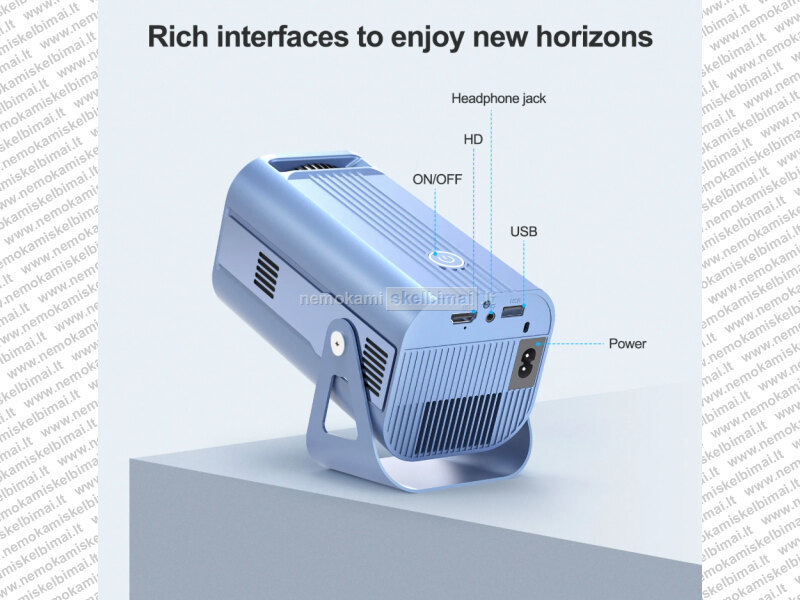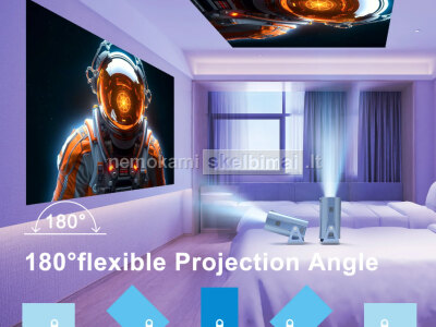 - ŽIŪRĖKITE MĖGSTAMĄ TURINĮ BET KURIOJE PADĖTYJE IR ANT BET KOKIO PAVIRŠIAUS! NET JEI NĖRA LAISVOS SIENOS, TAI NE BĖDA – PROJEKTORIAUS KAMPĄ GALIMA REGULIOTI 180°, TODĖL VAIZDĄ NESUNKIAI NUKREIPSITE NET Į LUBAS IR MĖGAUKITĖS ŽIŪRĖJIMU GULINT.