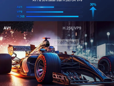 - Vaizdo failų kodavimas - DOLBY VISION, HDR 10+, AV1, 8K ULTRA HD/6K/4K/2K/Full HD, HEVC, Vivid World + HDR, VP9, 4K Ultimate HD, H.265,