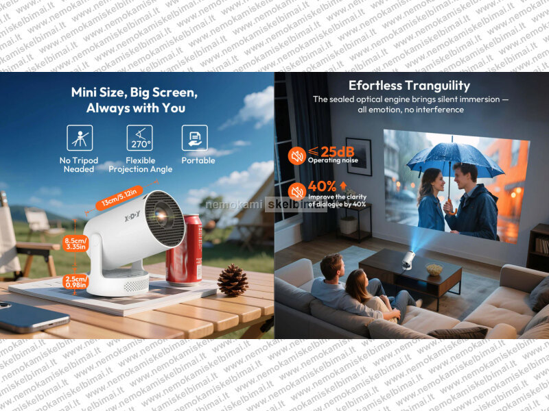 - TYLUS VEIKIMAS IR PATOGUS TRANSPORTAVIMAS DARO ŠĮ PROJEKTORIŲ IDEALŲ NAUDOTI TIEK NAMUOSE, TIEK LAUKĖ.