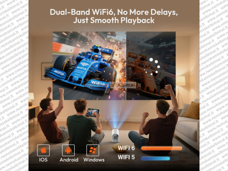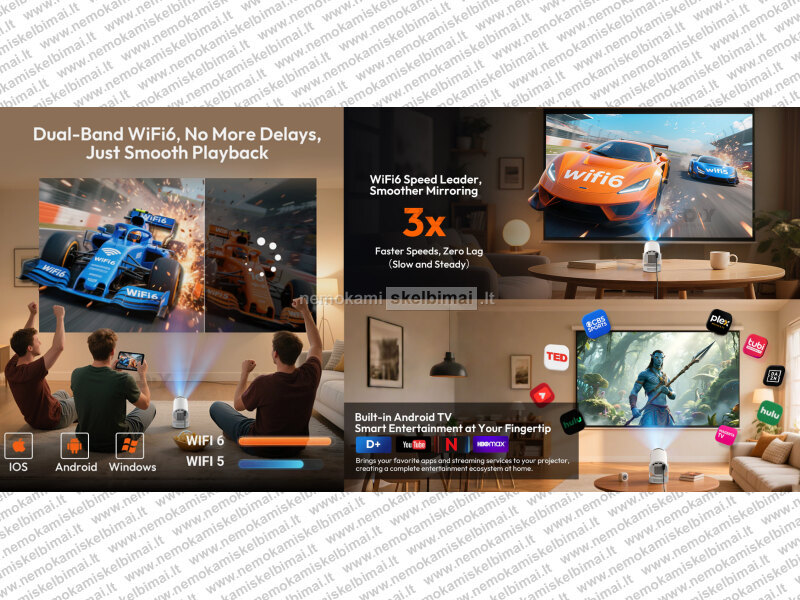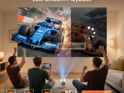 - Wi-Fi 6Ghz/5Ghz/2.4Ghz SU MIRACAST IR AIRPLAY PALAIKYMU – MĖGAUKITĖS VAIZDO ĮRAŠAIS, ŽAIDIMAIS, NUOTRAUKOMIS iš SAVO IŠMANIOJO TELEFONO, PLANŠETINIO KOMPIUTERIO AR KOMPIUTERIO BELAIDŽIU RYŠIU DIDELIAME EKRANE,