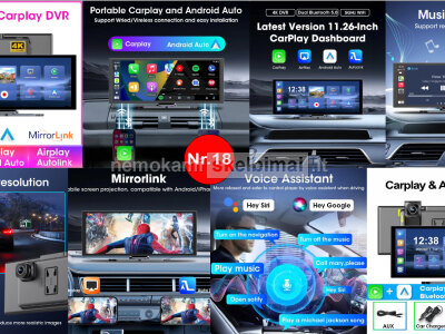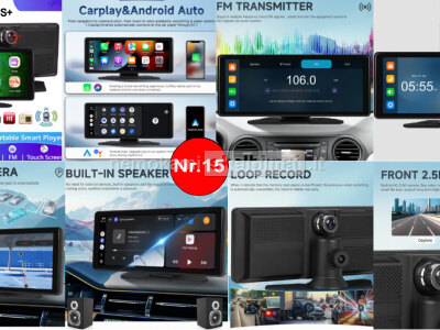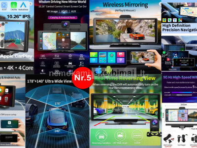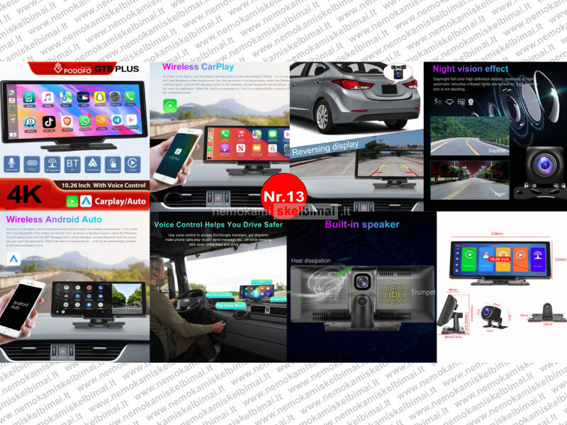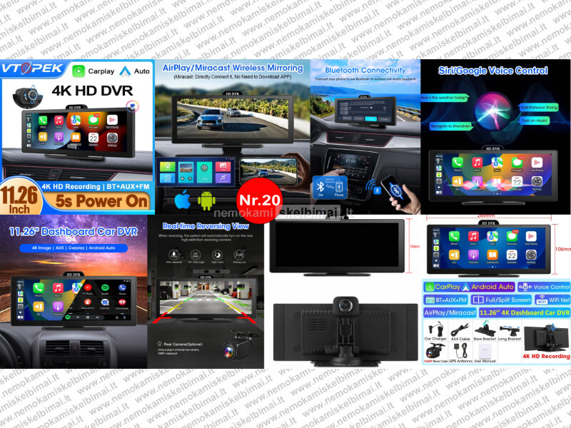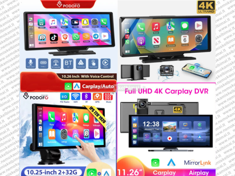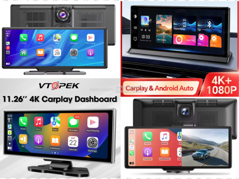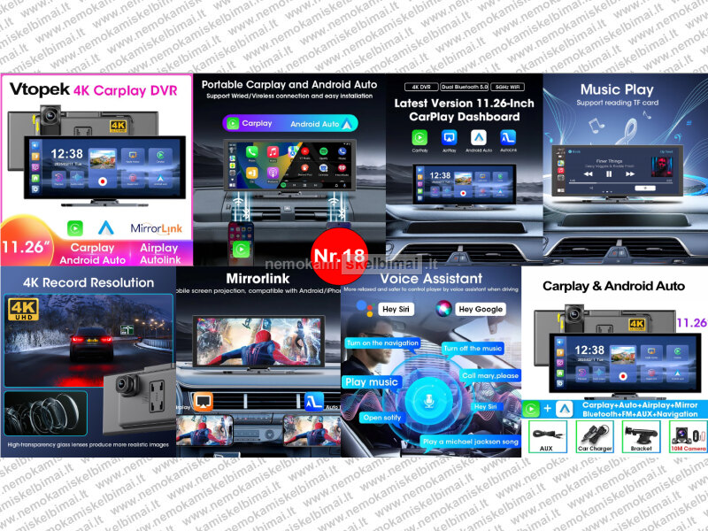 • VTOPEK 4K HD DVR 11.26" – 4K + 1080P, belaidis CarPlay / Android Auto, GPS, Bluetooth / FM / AUX.