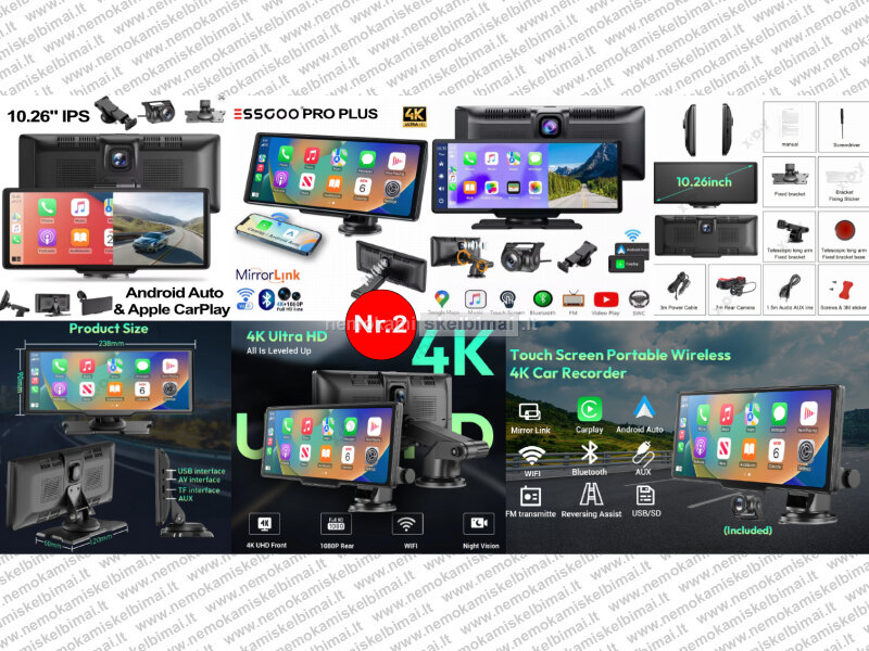 • NAUJAS ESSGOO PRO PLUS – 10.26" ekranas su 4K priekinė ir 1080P galinė kamera, belaidžiu CarPlay / Android Auto, Wi-Fi, Bluetooth, FM, AUX ir GPS navigacija.