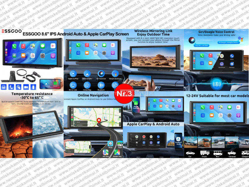 • ESSGOO 8.6" – Šiuolaikiškas automobilio ekranas su belaidžiu Apple CarPlay ir Android Auto.