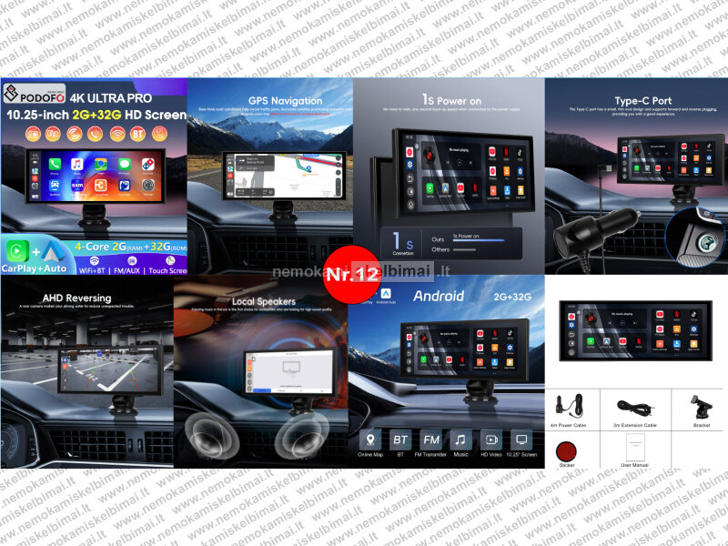 • PODOFO ULTRA PRO 10.25" (2+32GB) – išmanus automobilio ekranas su Android 15, belaidžiu CarPlay / Android Auto ir 1080P kamera.