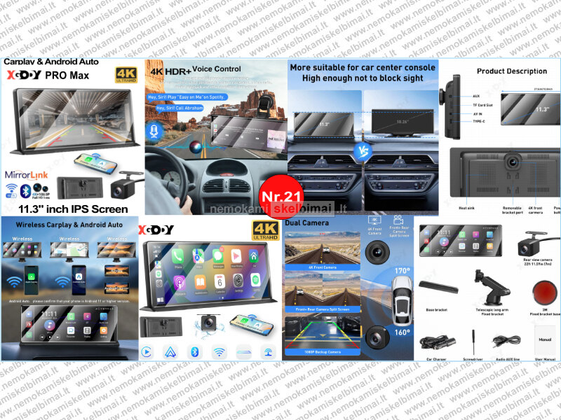 • XGODY PRO MAX 11.3" – 4K + 1080P, belaidis CarPlay / Android Auto, WDR, Bluetooth / FM / AUX, Wi-Fi, Split Screen.
