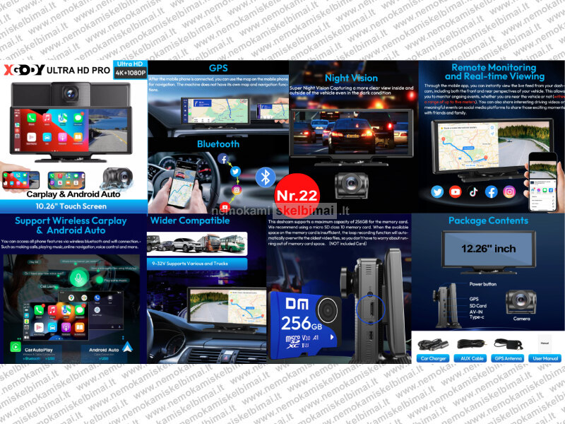 • XGODY ULTRA HD PRO 10.26" – 4K + 1080P, belaidis CarPlay / Android Auto, dual Bluetooth, Wi-Fi, AUX / FM, 64GB SD.