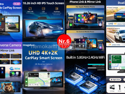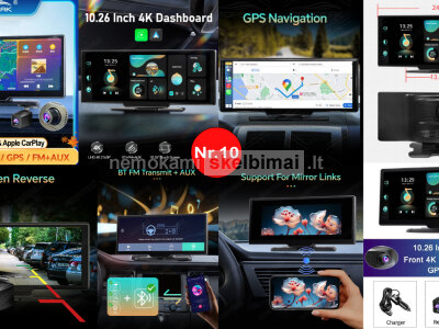 • VTOPEK 4K DUAL 10.26" – belaidis CarPlay / Android Auto, 4K priekinė + 1080P galinė kamera, GPS, Wi-Fi, FM / AUX / Bluetooth.