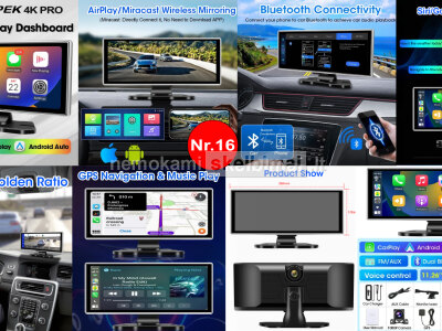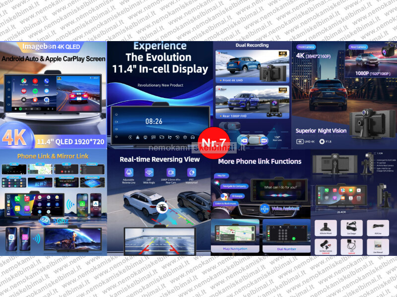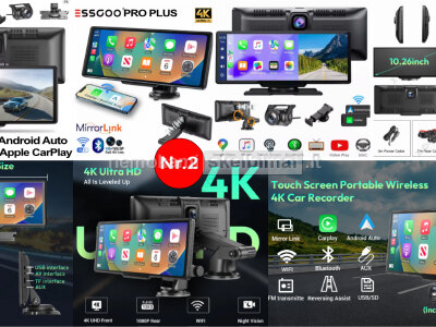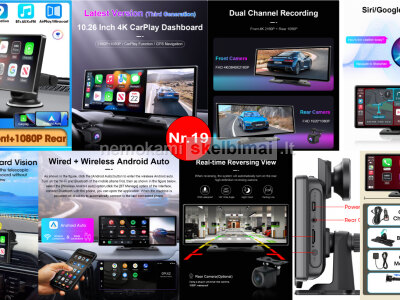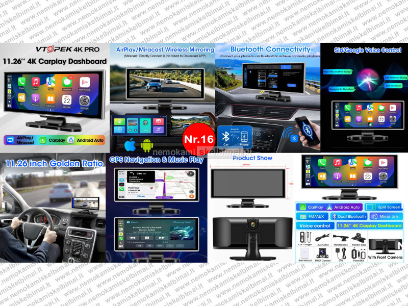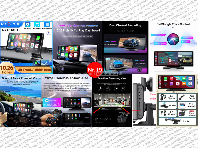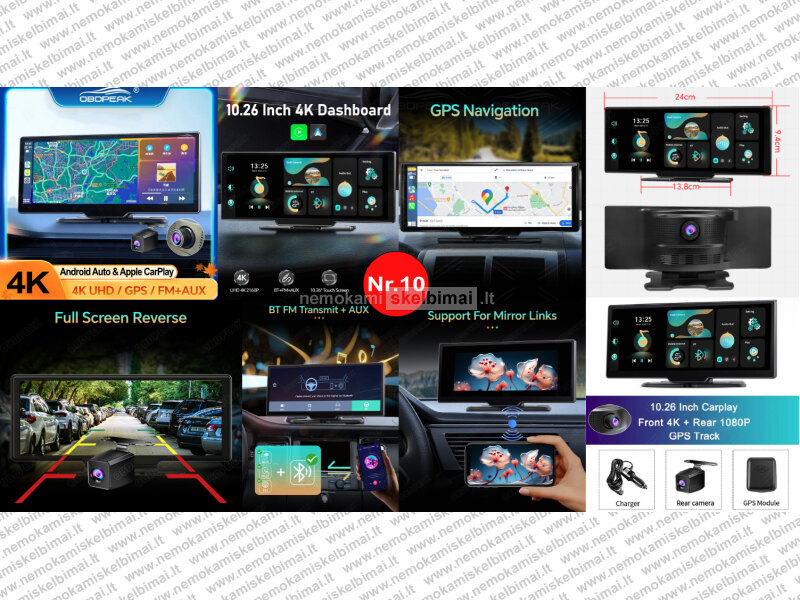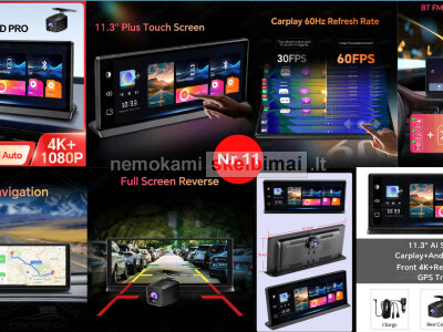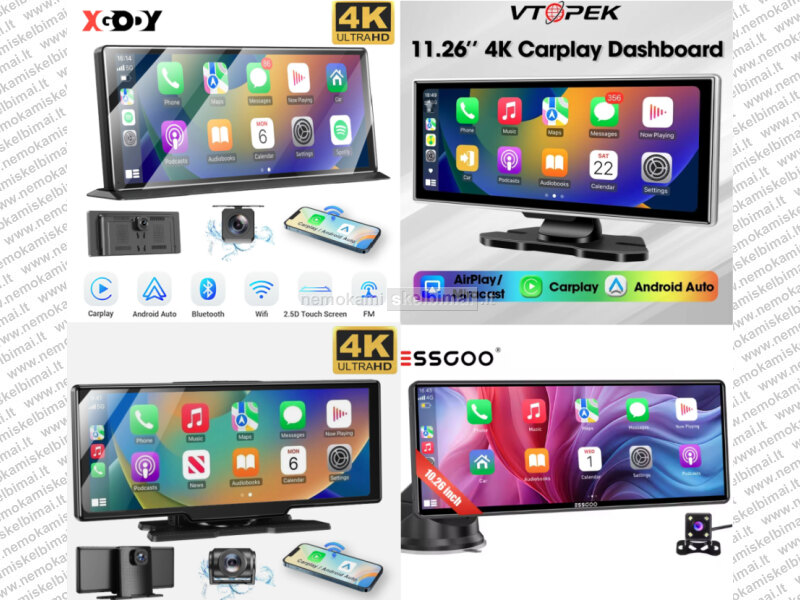 • VTOPEK 4K HD DVR 11.26" – 4K + 1080P, belaidis CarPlay / Android Auto, GPS, Bluetooth / FM / AUX.