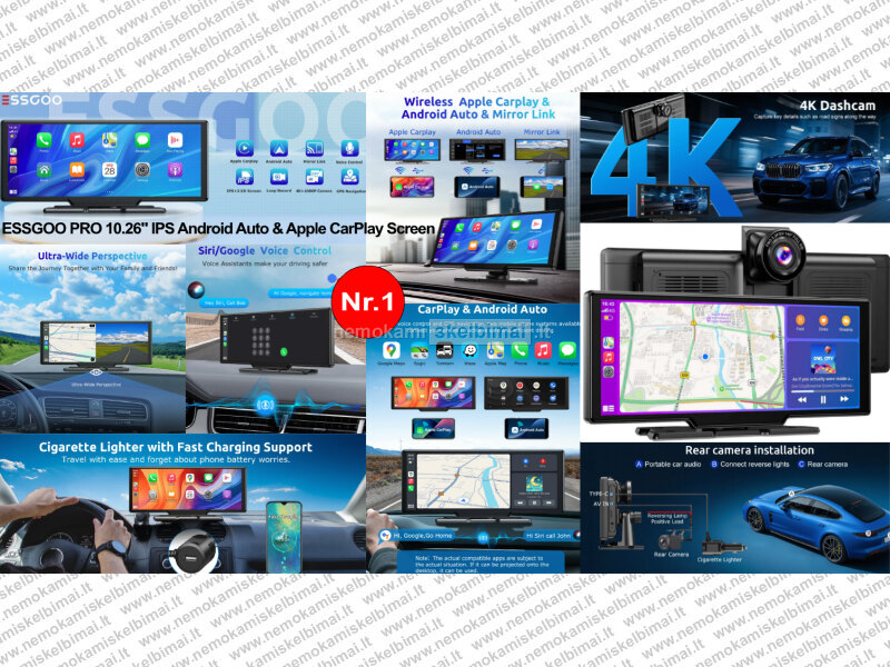 • NAUJAS ESSGOO PRO PLUS – 10.26" ekranas su 4K priekinė ir 1080P galinė kamera, belaidžiu CarPlay / Android Auto, Wi-Fi, Bluetooth, FM, AUX ir GPS navigacija.
