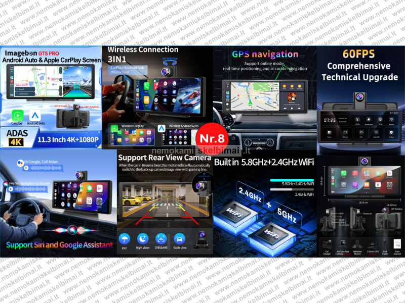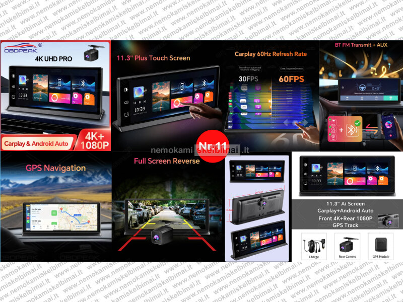 • XGODY PRO MAX 11.3" – 4K + 1080P, belaidis CarPlay / Android Auto, WDR, Bluetooth / FM / AUX, Wi-Fi, Split Screen.