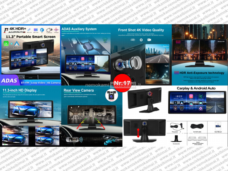• AMPrime 4K HDR+ 11.3" – belaidis CarPlay / Android Auto su ADAS, Wi-Fi, FM ir 4K DVR.