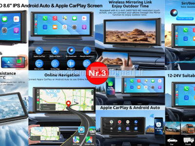 • ESSGOO 8.6" – Šiuolaikiškas automobilio ekranas su belaidžiu Apple CarPlay ir Android Auto.
