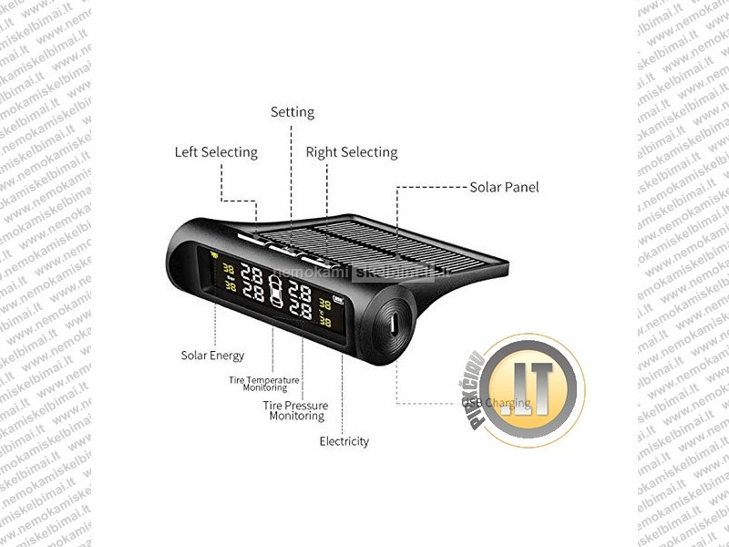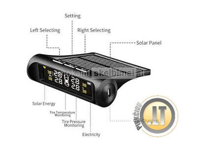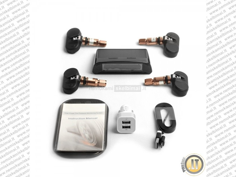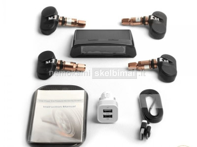 PRIEDAI: 1x saulės padangų slėgio matuoklis + 4x vidinių , padangų slėgio jutikliai + 1x neslystantis kilimėlis + 1x anglų vartotojo vadovas + 1x automatinis USB įkroviklis ir kabelis