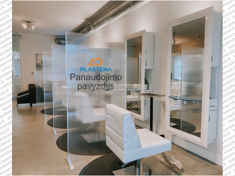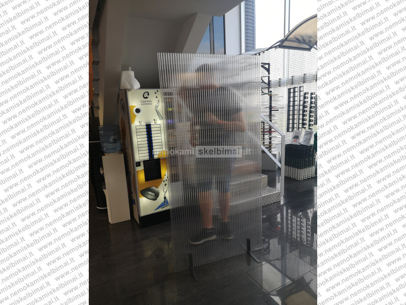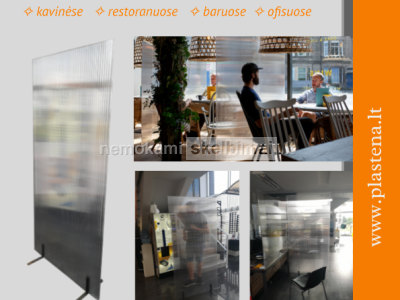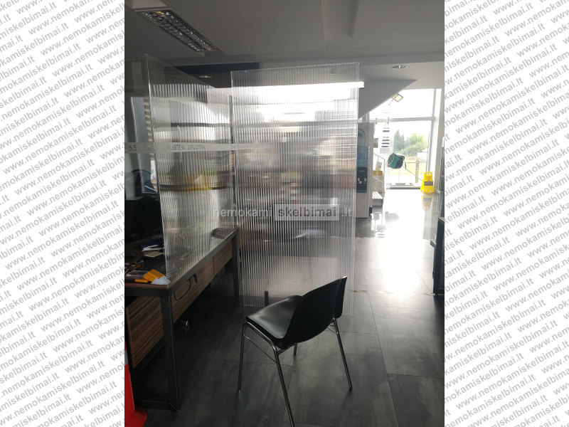 Šios apsauginės kanalinio polikarbonato pertvaros susideda iš trijų dalių (dviejų metalinių kojelių ir pagrindinės dalies), kurios yra lengvai surenkamos tarpusavyje. Naudojamas 16 mm polikarbonatas itin tvirtas, įstačius į kojeles nesiūbuoja.