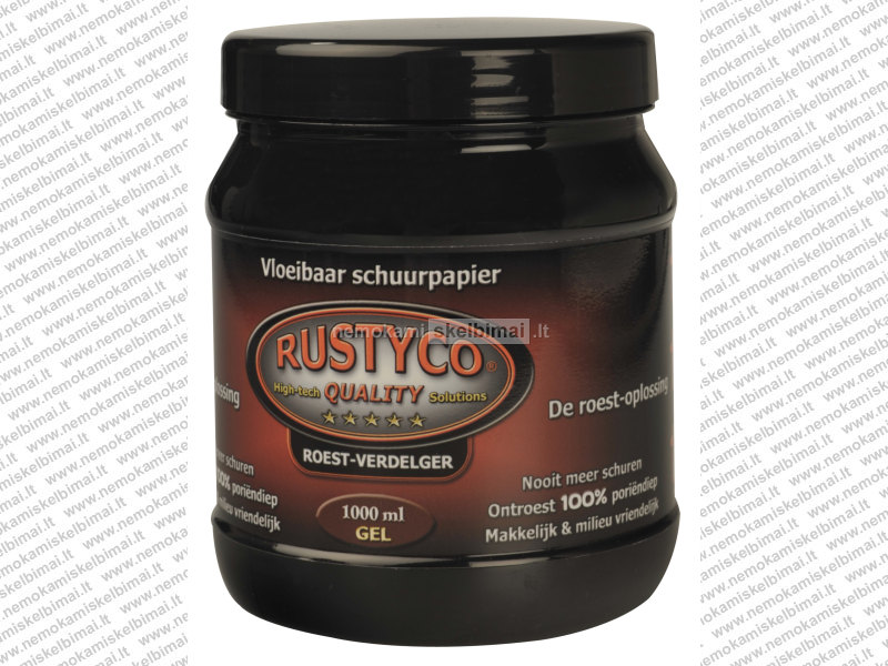 RUSTYCO Gelis. rūdžių tirpiklis, gali būti taikomos su teptuku. Pašalina rūdis nuo plieno, nerūdijančio plieno, aliuminio ir t.t. Tai ne rūdžių modifikatorius. Tai yra idealus substratas visiems gruntams ir dažams. RUSTYCO rūdžių šalinimo priemonė nepakenks daugelio rūšių lakui, plastikui, medžiui, gumai, stiklui, variui, chromui ir kitiems.