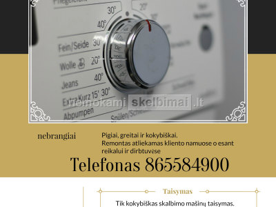 Skubus meistro iškvietimas į namus. Jeigu sugedo skalbimo mašina, nelaukite- skambinkite meistrui. Meistras nebrangiai sutaiso skalbimo mašiną, atvyksta į namus ir suremontuoja, jeigu namuose nepavyksta suremontuoti išsiveža į taisyklą. Klientui nereikia tampytis KILNOTI sunkios skalbimo mašinos, Viską nuo A iki Z padaro meistras už NEBRANGIAI! Kiekvienas klientas net su menkiausios smulkmenos gedimu yra laukiamas. Visi gedimai pašalinami, nuo lengvų iki pačių sunkiausiu. Skambinkite jums patogiu metu- budintis meistras visada laukia skambučių.
