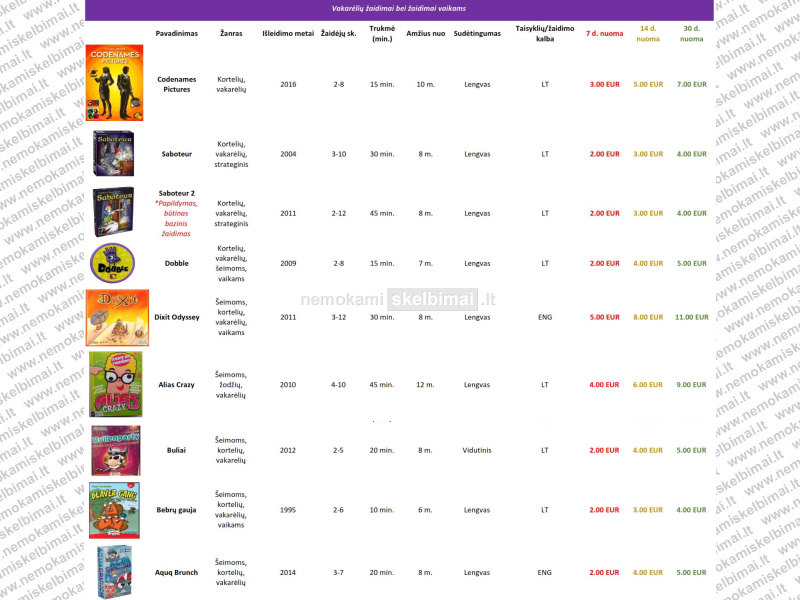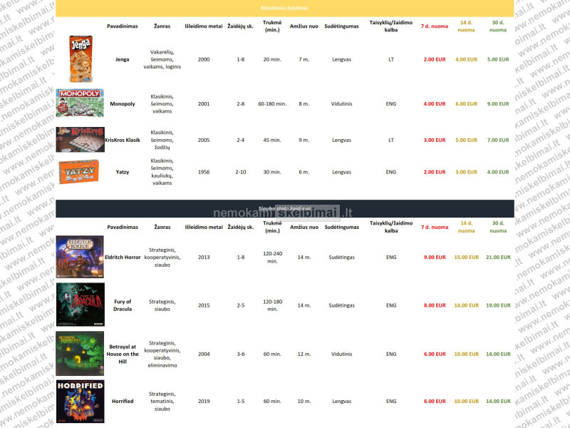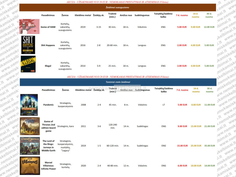 Nuomuojame stalo žaidimus Vilniuje. Pristatome stalo žaidimus į namus, bei atvykstame juos atsiimti. Smagiai praleiskite laiką namuose, su šeima, draugais, bei giminėmis, žaisdami stalo žaidimus!