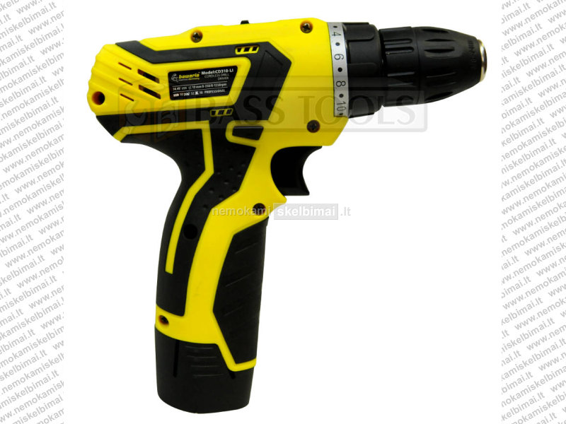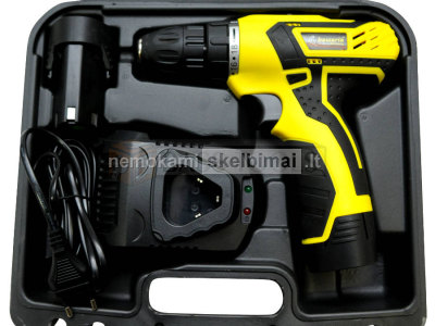 Ličio jonų elementai, du akumuliatoriai, pakrovėjas, lagaminas. Lengvas, kompaktiškas su diodiniu pašvietimu, dviejų bėgių, reguliuojamas sukimo galingumas 19 padėčių.