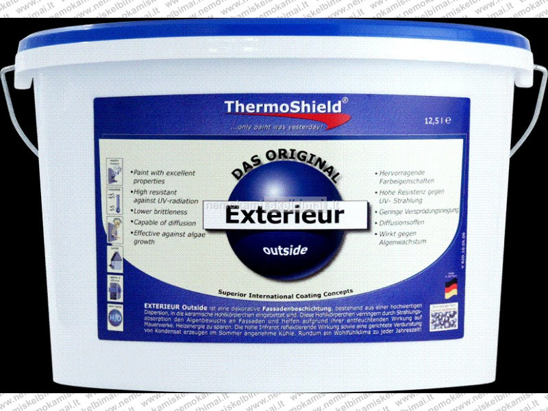 Thermoshield Exterieur (termokeraminiai fasadams) – paruošta naudoti atspari fasadų danga. Pagaminta pagal termokeramikinę membraninę technologiją. Ji tinka padengti iš išorės beveik visas medžiagas (mūras, betonas, tinkas, metalas, medis). Praleidžia vandens garus,neleidžia susidaryti pelėsiui, atsparus ugniai, mechaniniams pažeidimams, pasižymi aukštomis termoizoliacinėmis savybėmis.