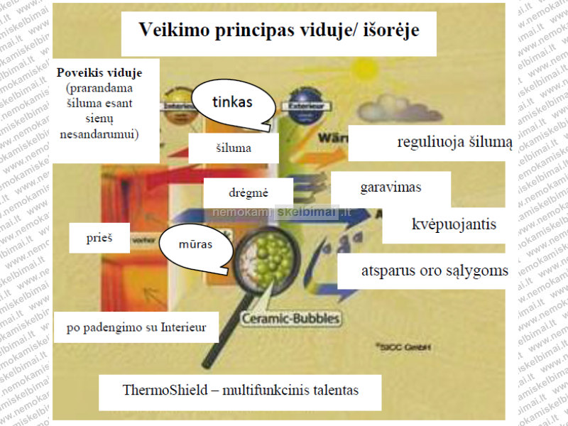 ТhеrmоShield Exterieur turi kintamą laidumą difuzijai ir tuo pačiu užtikrina drėgmės pasišalinimą sienos kapiliarais į išorę. Kadangi danga ТhеrmоShield Exterieur reguliuoja drėgnumą, tai užkerta kelią nepageidautinam fasadų „pažaliavimui“. Nėra sąlygų augti samanoms, grybeliams, pelėsiams ir vandens augalams. Nereikia jokių chemikalų.