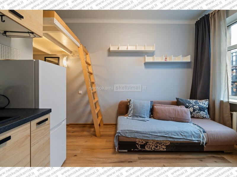 Nuomojamas jaukus 1 kambario butas-studija su antresole patogioje Senamiesčio vietoje, Aguonų gatvėje, Vilniuje.